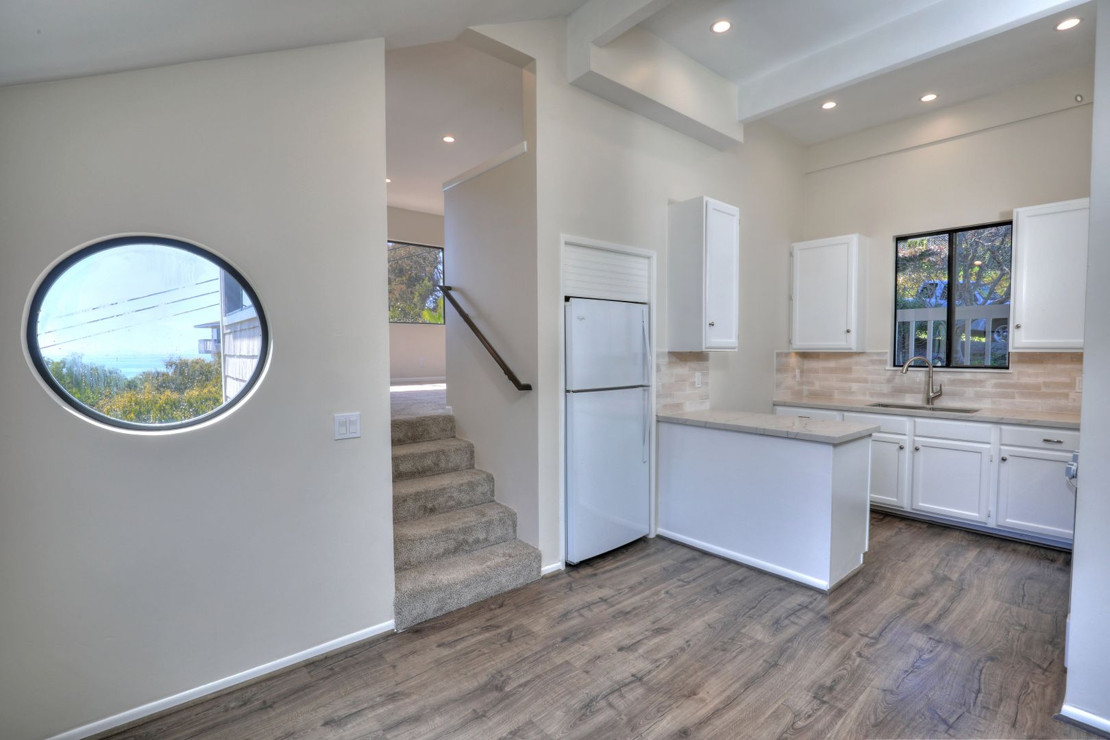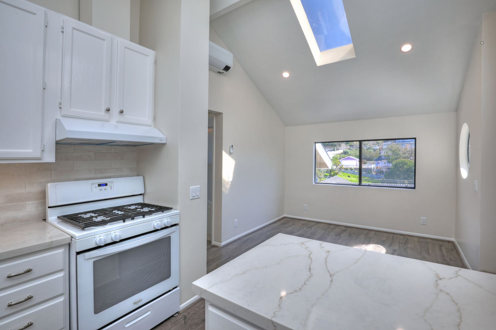 Spectacular Ocean, Island Views with patio deck! 2 BR 1 bath in quiet duplex located on a quiet street tucked away, still within walking distance to Summerland beach and Lookout Park. Find peace and serenity along with exquisite character of this updated home. Privately situated, second story unit with a cozy fireplace and large breathtaking views with wall to wall windows and sliding door to the deck. Updated kitchen with quartz countertops, ceramic backsplash, robust cabinetry including a kitchen island. Energy efficient remote controlled HVAC unit for ultimate comfort all year long. Bathroom features modern shower and designer finishes. Primary bedroom feels massive with vaulted ceilings, walk-in closet and ocean view. Second bedroom also boasts vaulted ceilings with ample storage and closet space. Enjoy the Summerland community with all it has to offer in a terrific walkable location.